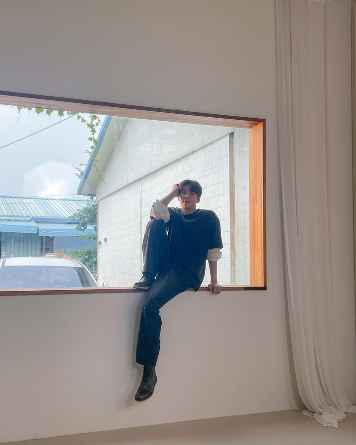 Tampil swag, Kim Seon Ho memadukan kaos model sambung panjang dengan long pants serta boots yang kesemuanya berwarna gelap. Ia lantas berpose bak model papan atas di jendela.