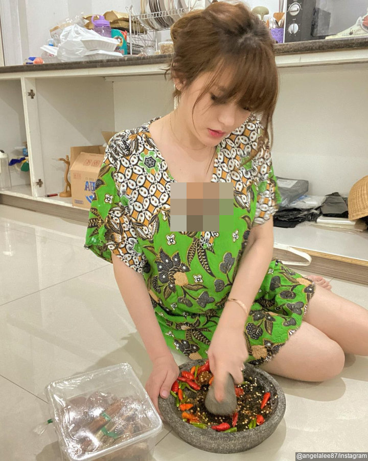 Sebagai ibu pada umumnya, Angela suka memakai daster saat beraktivitas di dalam rumah. Dalam foto tersebut terlihat Angela sibuk mengulek sambal di cobek batu dan duduk lesehan dengan mengenakan daster warna hijau.