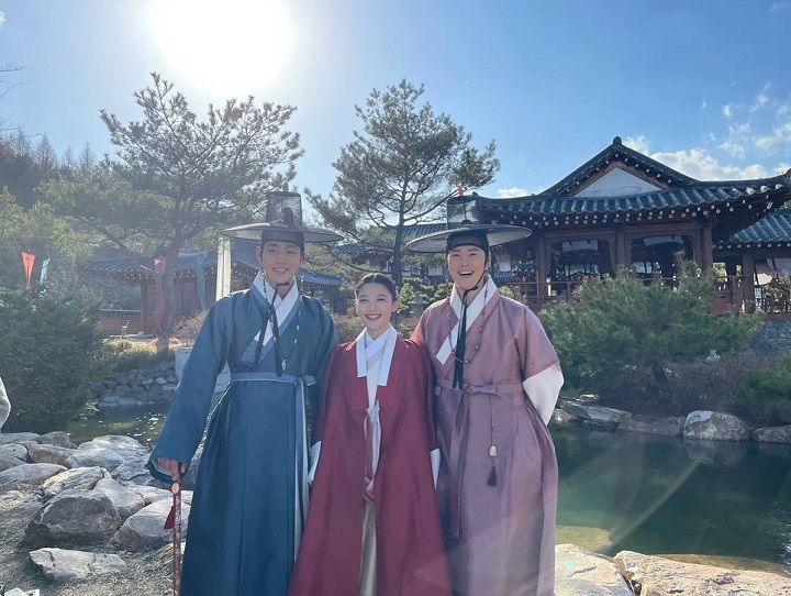 Gong Myung begitu akrab dengan pemeran drama "Red Sky" yang lain. Tampak jelas di momen kali ini, Gong Myung bersama Kim Yoo Jung dan Ahn Hyo Seop mengambil foto bersama di sela-sela break syuting. Ketiganya tersenyum lebar bak kawan yang lama tak bersua.