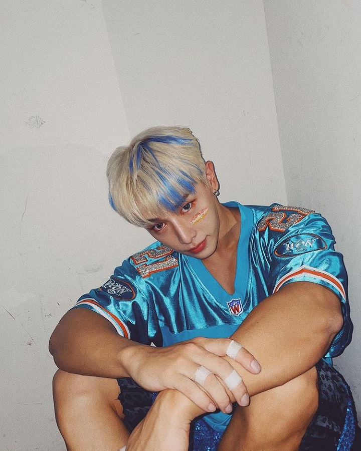 Wonho dikenal sebagai sosok manly dan imej cool. Namun tak jarang ia juga menampilkan sisi menggemaskannya. Di momen kali ini, ia berpose lucu sembari tersenyum menyapa penggemar dengan finger heart.