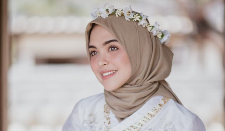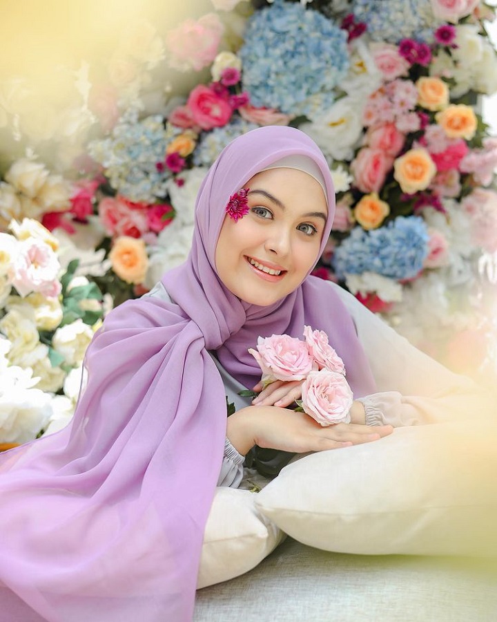 Vebby tampil penuh warna dalam balutan busana cerha perpaduan dress abu muda dan hijab lylac. Artis sekaligus penyanyi berusia 25 tahun itu tampak dikelilingi hamparan bunga. Bak peri bunga, potret Vebby tampak eye catching.