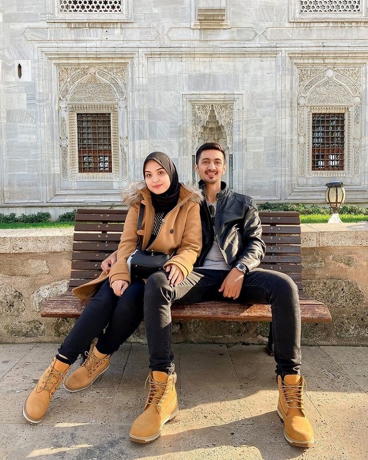 Pasangan ini tampak semakin romantis dengan busana selaras. Vebby mengenakan straight pants hitam, kaos serta coat cokelat. Sementara Razi tampan dengan kaos, jaket leather dan jeans. Keduanya mengenakan sepatu boots couple. Western vibe banget!