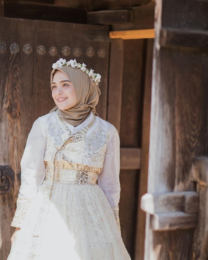Tampil ala eonni Korea, Vebby memesona dalam balutan hanbok putih. Terdapat motif bunga dan perpaudan warn emas pada hanbok yang dipakai oleh ibu satu anak ini. Vebby semakin anggun dan memesona dengan flower crown yang menempel di kepal cantiknya.
