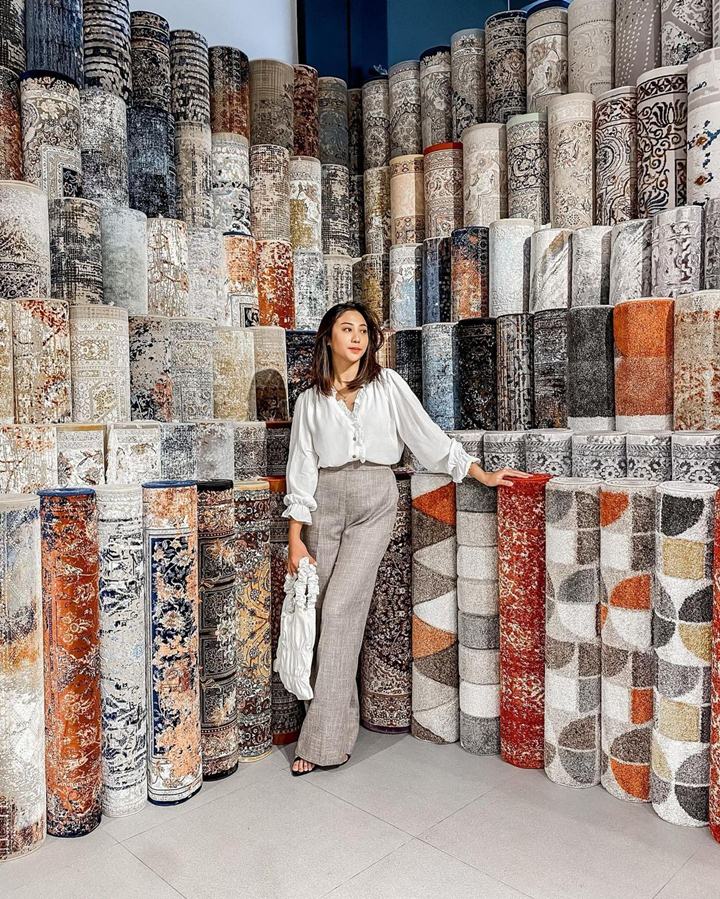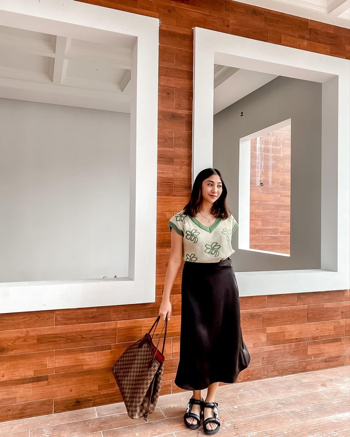 Nona memang sangat senang membagikan ide mix and match kepada followers-nya. Nona tampil anggun dan berkelas dengan memadukan atasan hijau dengan rok midi warna hitam juga sepatu sandal yang nyaman.