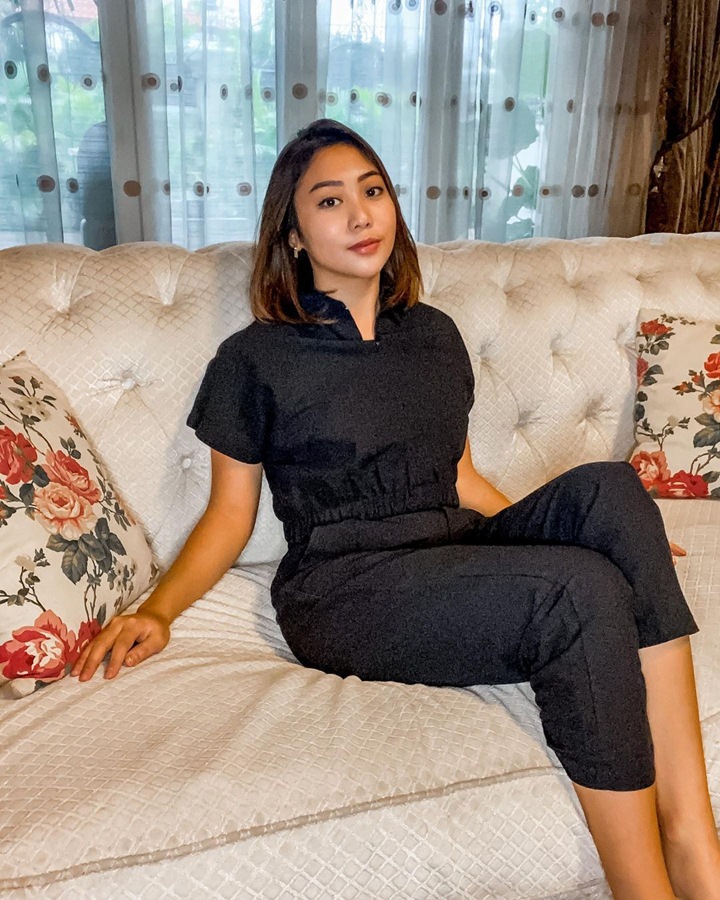 Nona tampil cerah meskipun memakai busana serba hitam. Nona tampak duduk bersandar di sebuah sofa dan menatap kamera tanpa ekspresi. Nona kembali terlihat catchy dengan produk lokal yang sederhana itu.