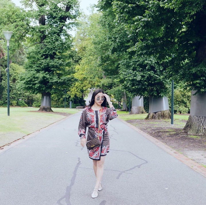 Nona memang sangat mencintai produk Indonesia. Aktris berzodiak Libra ini terlihat anggun dan elegan saat mengunjungi Melbourne dengan mengenakan gaun batik bernuansa merah muda itu. Nona juga memakai kacamata hitam untuk melengkapi penampilannya.