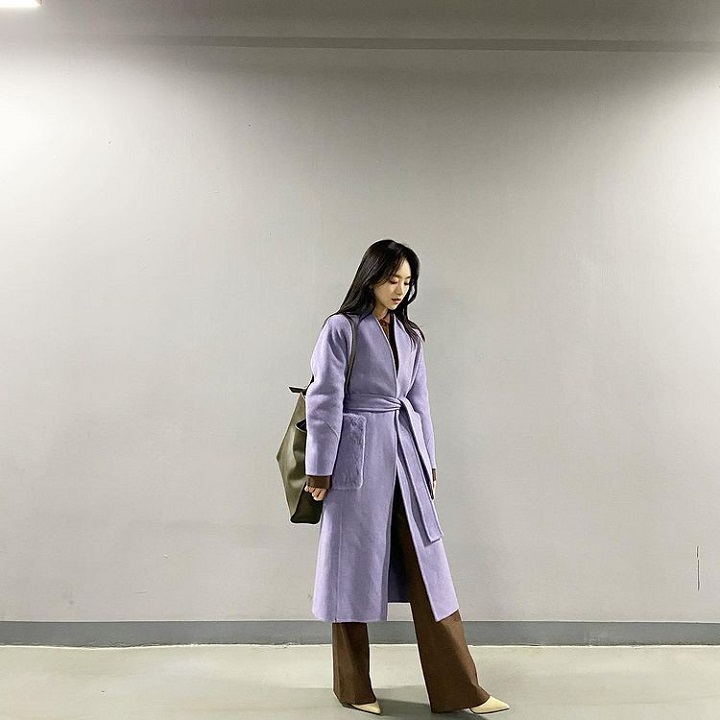 Padu-padan outfit Won Jin Ah selalu gagal anti flop. Dalam momen kali ini, ia tampak menawan dengan perpaduan long coat ungu muda dan setelan cokelat. Won Jin Ah mengenakan heels dan tote bag untuk mempermanis penampilan.