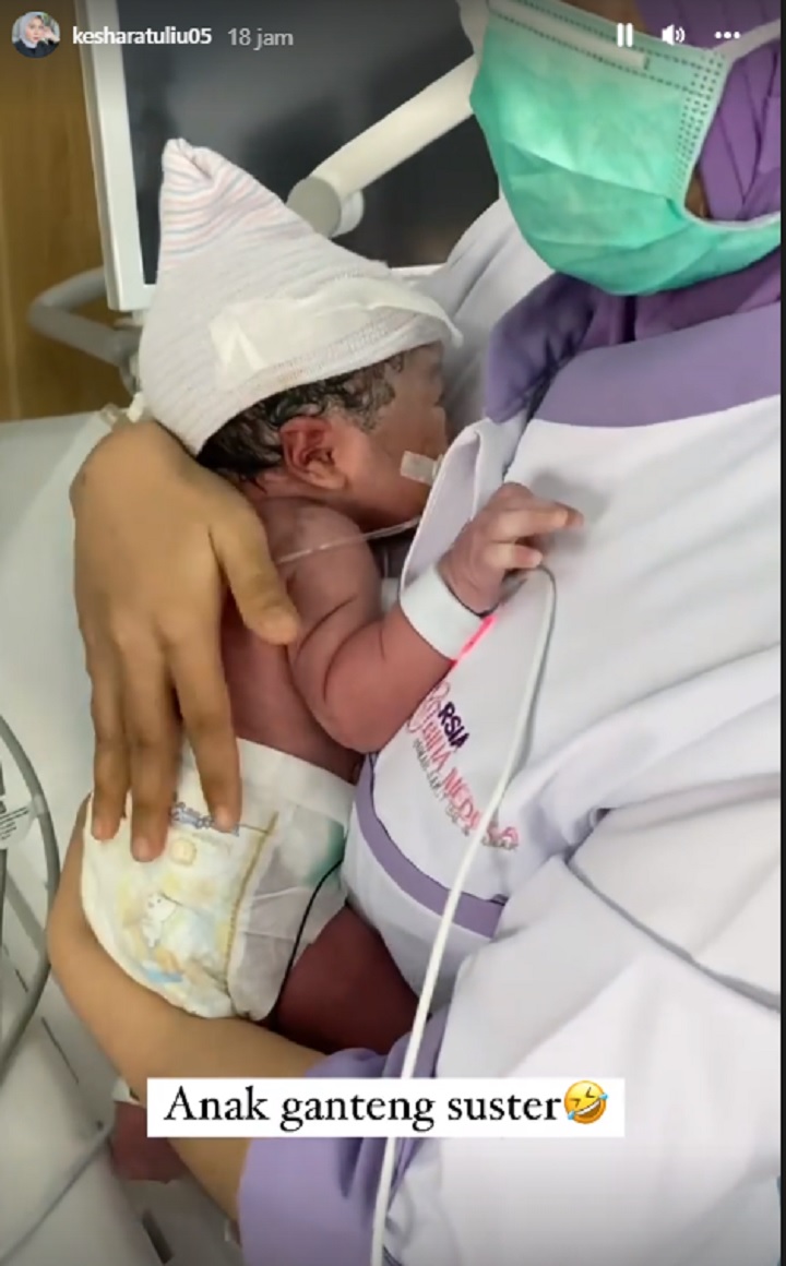 Kesha terus mengupdate kondisi Qwenzy lewat Instagram Story. Dalam unggahan kali ini, Qwenzy tampak dipeluk sayang oleh suster yang bertugas merawatnya. Bayi mungil itu terlihat menangis kencang.