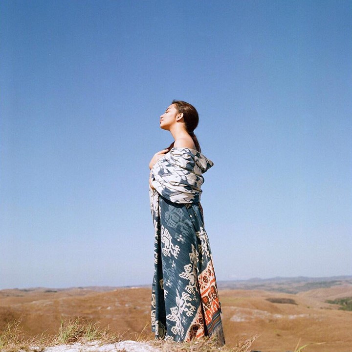 Anggun berbalut kain Sumba, Ariel berpose berdiri sembari memejamkan mata seolah menikmati semilir angin. Mantan kekasih Marcello Tahitoe ini tengah berada di Bukit Wairinding. Pemandangan di sana terlihat indah meski tampak gersang.