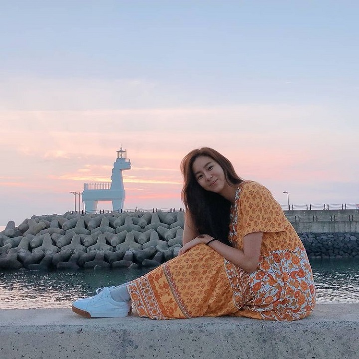 UEE tengah menikmati waktu di alam terbuka. Pemilik nama lahir Kim Yu Jin itu tampil bareface dengan gaya yang sederhana pula. UEE dibalut dress mirip daster serta sepatu keds. Ia tersenyum dan menyelonjorkan kaki.