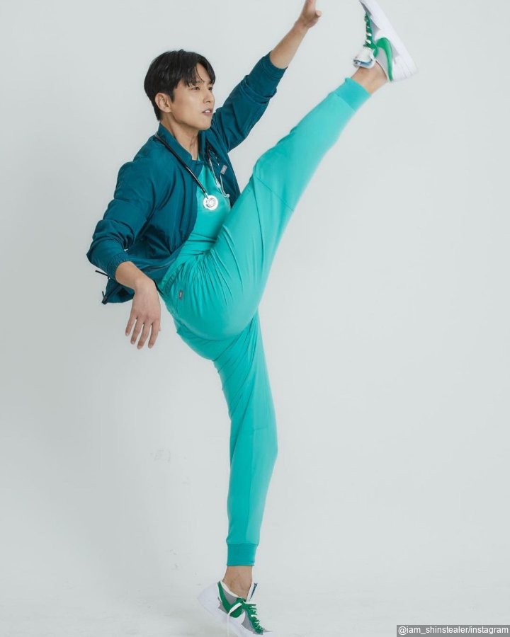 Enerjik banget, Shin Dong Wook pamer pemotretan dengan pose yang tak biasa. Bak tengah melakukan tendangan ala pencak silat, Shin Dong Wook mengangkat kakinya tinggi dengan luwes. Ia dibalut busana serba hijau dan tosca.