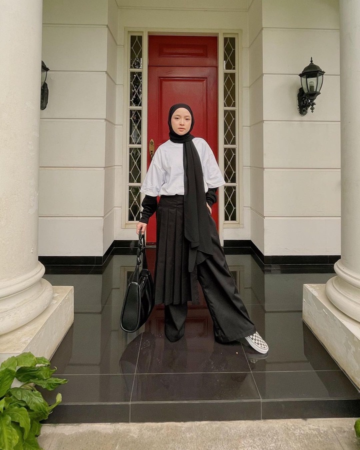 Nissa tampil modis dalam balutan busana semi formal. Ia memadukan atasan putih yang dimasukkan ke dalam rok hitam bermotif dengan outer berupa jas warna cerah. Penampilan Nissa semakin fashionable karena mengenakan jilbab hitam dan sneakers putih.