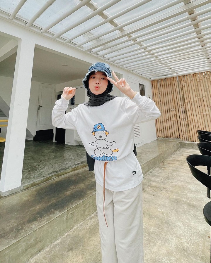 Artis kelahiran Lumajang ini juga mengikuti perkembangan mode, loh. Nissa juga tak mau ketinggalan ketika tren bucket hat yang populer di kalangan pemuda. Nissa tampak charming ketika memadukan topi tersebut dengan busana kasualnya.