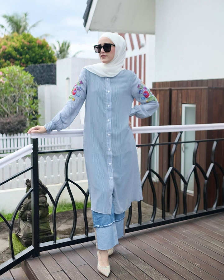 Tak melulu memakai baju formal, Adelia juga semakin bersinar saat mengenakan pakaian kasual. Ia tampak cerah dalam balutan busana serba biru dengan memadukan celana jeans bersama tunic yang memiliki detail embroidery flower di bagian tangan, Adelia semakin cantik karena mengenakan jilbab putih dan kacamata hitam.