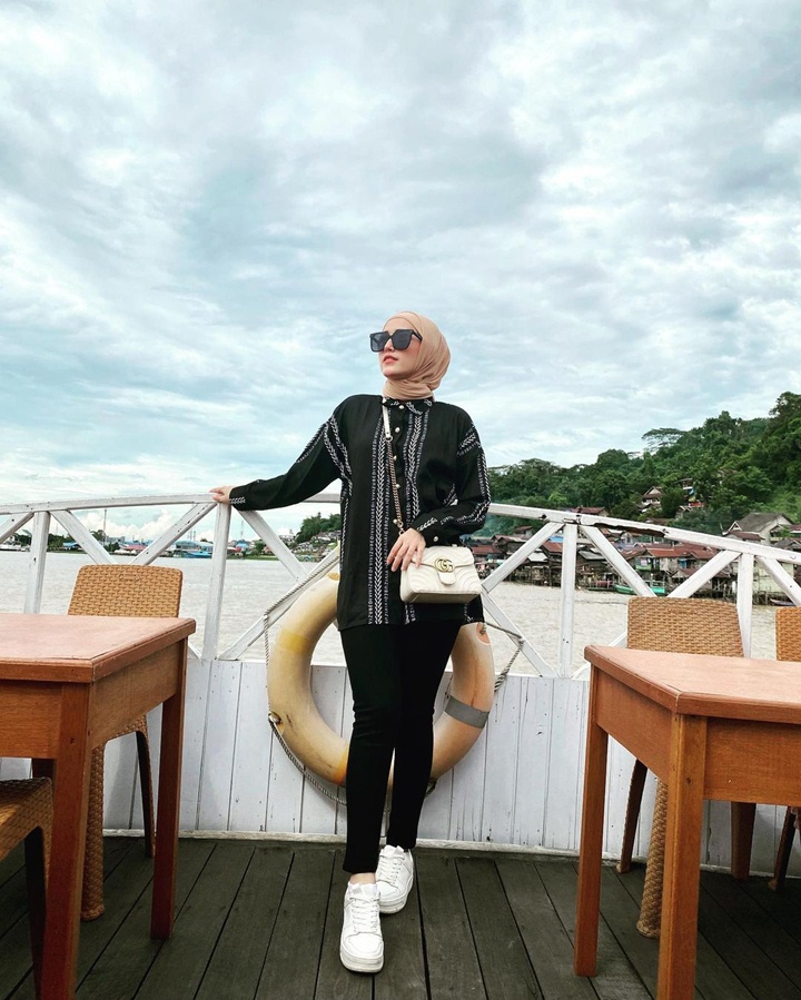 Satu lagi inspirasi lain untuk OOTD kasual yang simpel. Kali ini, Adelia mengusung tema bernuansa hitam pada gaya busananya. Ia mengenakan celana hitam dengan kemeja warna senada yang memiliki corak putih. Agar semakin kece, Adelia memakai sneakers putih dan jilbab warna krem.