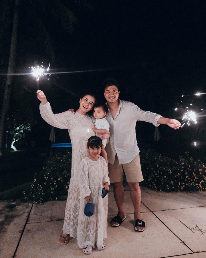 Chelsea dan Glenn tampak mengadakan pesta kembang api sederhana saat merayakan Tahun Baru 2022. Keluarga kecil tersebut tampil kompak dan serasi dalam balutan busana bernuansa warna putih sambil memainkan kembang api.
