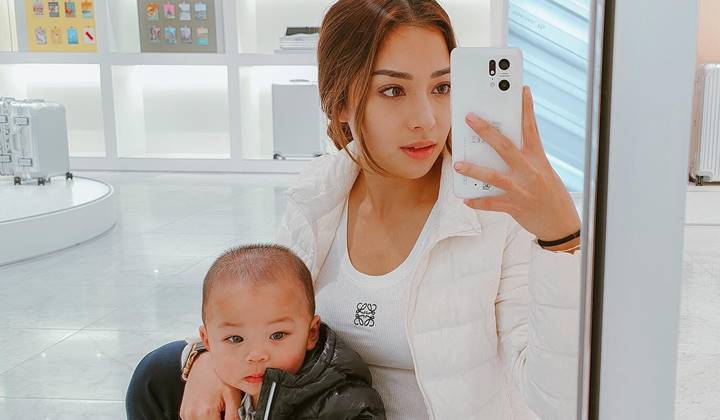 Nikita Willy tampak tersenyum bangga melihat baby Izz yang sudah bisa membantunya mendorong koper. "Little helper," tulis Nikita Willy di unggahannya.