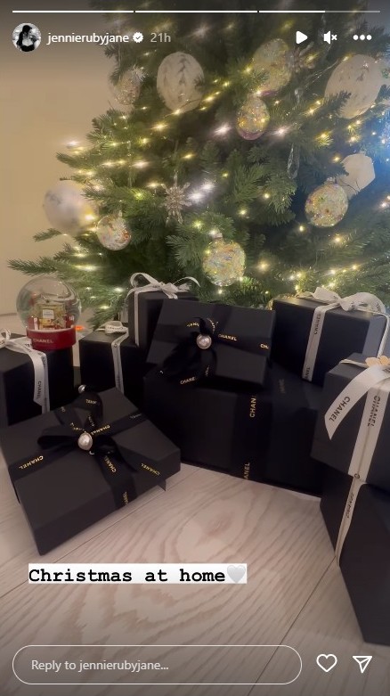 Sementara itu, Jennie BLACKPINK memilih untuk merayakan Natal di rumahnya. Lewat unggahan di Instagram Stories-nya, Jennie memamerkan pohon Natal yang besar. Namun, yang cukup menjadi sorotan adalah tumpukan kotak hadiah yang ada di bawah pohon Natal. Kotak-kotak hadiah itu dikemas dengan warna monokrom sehingga melengkapi kesan elegan yang dipadukan dengan gemerlapnya pohon Natal.