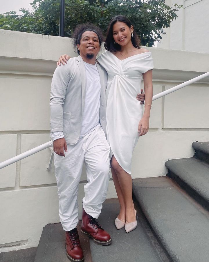 Selain menunjukkan momen kebersamaan, mereka ternyata juga kompak saat mengenakan OOTD. Seperti ketika keduanya mengenakan outfit warna putih. Berpose di tangga, tampak Indah yang mengenakan gaun warna putih menggandeng mesra sang suami yang juga mengenakan outfit dengan warna senada.