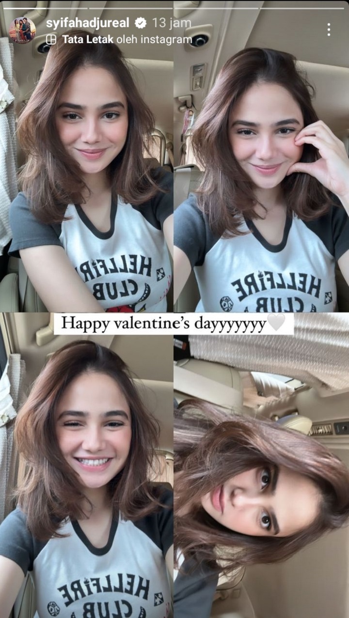 Di momen Valentine, Syifa Hadju menunggah foto selfie sndirian alih-alih bersama dengan sang pacar, Rizky Nazar. Dalam postingannya, Syifa tengah berada di dalam sebuah mobil dan mengabadikan serangkaian selfie beragam pose. "Happy valentine's dayyyyyy" tulis sang aktris di foto.