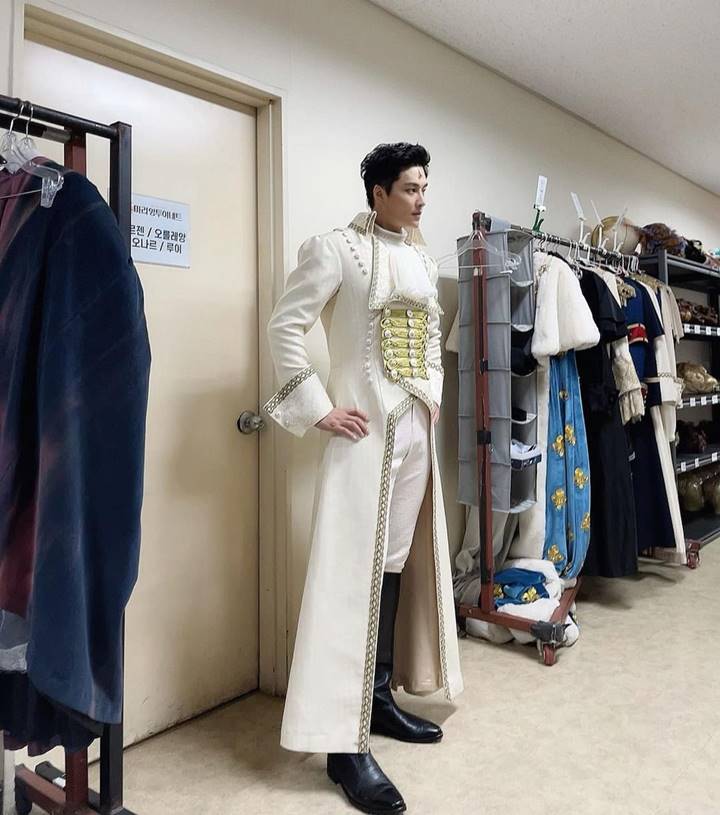Aktor berusia 39 tahun ini tampak menawan dalam balutan busana ala pangeran kerajaan Eropa warna putih. Terdapat aksen ruffle yang unik di bagian dada, sementara ada tambahan lukisan kecil di dahi. Bak menjelma menjadi karakter game yang sempurna, rupanya Woo Hyuk memakai kostum ini untuk musikal "Marie Antoinette".
