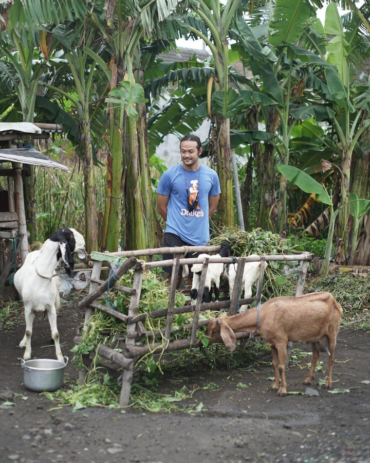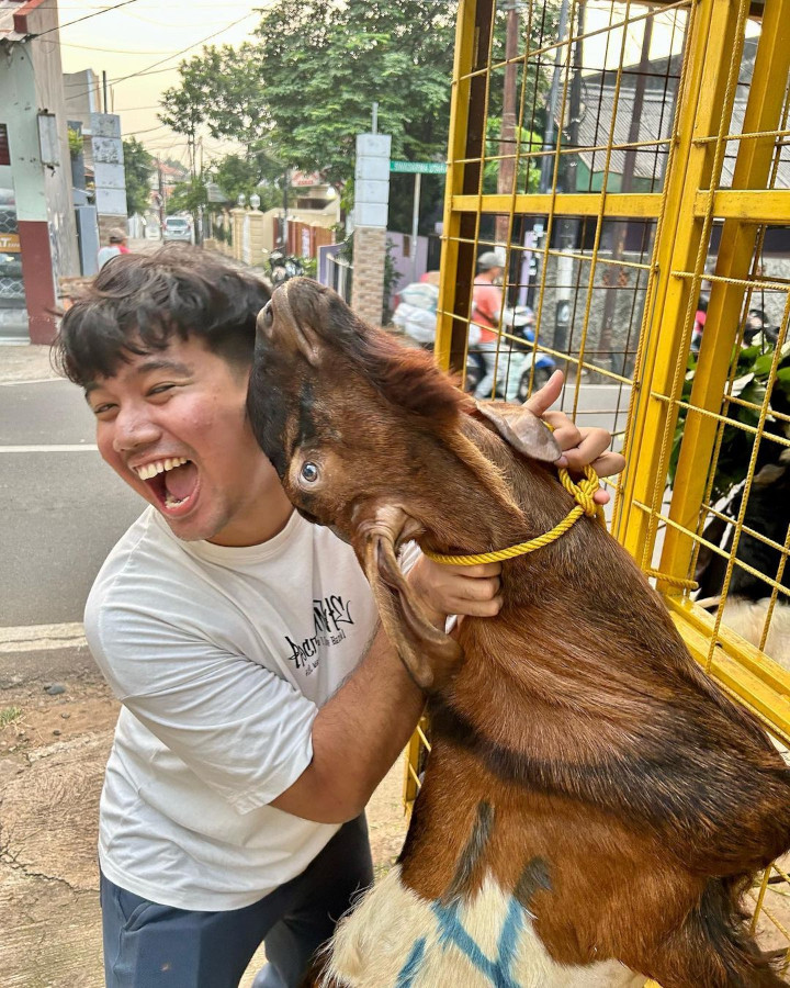 Frans Faisal kakak Fuji juga membagikan potretnya bareng hewan kurban pilihannya, yaitu kambing. Dalam foto, ia terlihat bahagia berpose dengan berbagai gaya yang mengocok perut. Dengan kocak, Frans menyebut kambingnya yang disebutnya dengan panggilan Ayang.