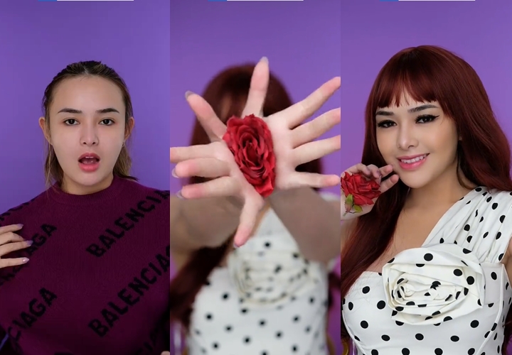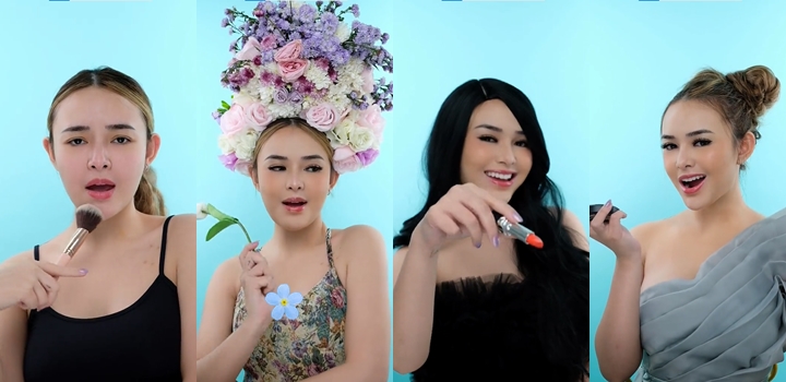 Oke, kali ini bintang sinetron "Mermaid in Love" ini bertransformasi dengan banyak model gaya make up. Yang paling unik adalah model tumpukan bunga yang menghiasi kepala serta setangkai mawar yang dipegangnya. Gaya Riasannya akan berganti mengikuti lagu "Flower" yang dipopulerkan oleh Miley Cyrus.