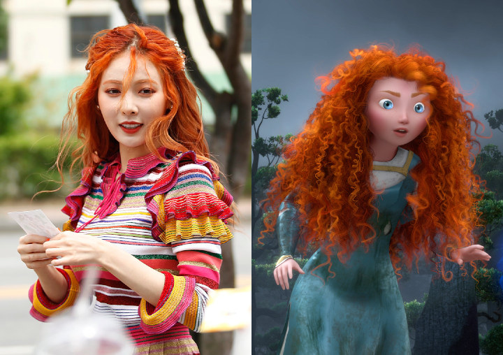 Rambut Hyuna yang sangat keriting, bintik-bintik, dan pipi merah muda memberinya kemiripan yang kuat dengan Merida dari "Brave". Mereka dua contoh sempurna wanita keras kepala dan kemampuan yang kuat. Hyuna dikenal suka gonta-ganti warna serta gaya rambut. Penampilannya dengan rambut mekar berwarna jingga ini pun tampak cocok dengannya.